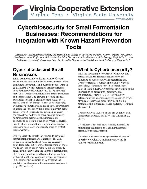 Small businesses have a higher chance of cyber-based attacks, due to the use of home internet-linked computers for personal and business needs (Duncan et al., 2019). Twenty percent of small businesses have been hacked (Duncan et al., 2019), showing that cyber-attacks are not limited to larger businesses and corporations. The growing pressure of small businesses to adopt a digital presence (e.g., social media, web-based sales) as a means of competing with larger competitors also requires these producers to assess the food safety risks associated with being online. Cyberbiosecurity has emerged as a new framework for addressing these specific types of hazards. Small fermentation businesses are encouraged to learn the basics of cyberbiosecurity, how to identify smart technology and automation in their own businesses and identify ways to protect their operations.