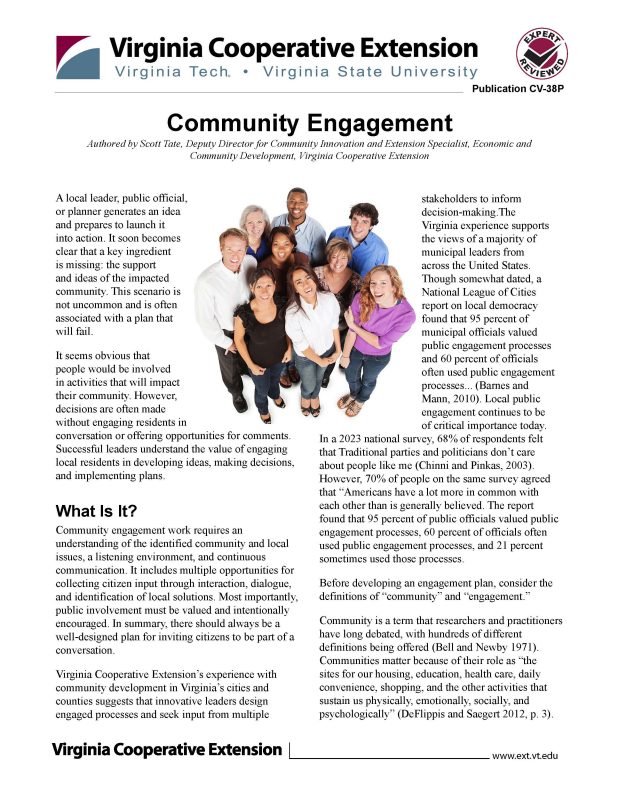 Virginia Cooperative Extension’s experience with community development in Virginia’s cities and counties suggests that innovative leaders design engaged processes and seek input from multiple stakeholders to inform decision-making. The Virginia experience supports the views of a majority of municipal leaders from across the United States. Though somewhat dated, a National League of Cities report on local democracy found that 95 percent of municipal officials valued public engagement processes and 60 percent of officials often used public engagement processes... (Barnes and Mann, 2010). Local public engagement continues to be of critical importance today. In a 2023 national survey, 68% of respondents felt that “Traditional parties and politicians don’t care about people like me” (Chinni and Pinkas, 2003). However, 70% of people on the same survey agreed that “Americans have a lot more in common with each other than is generally believed."